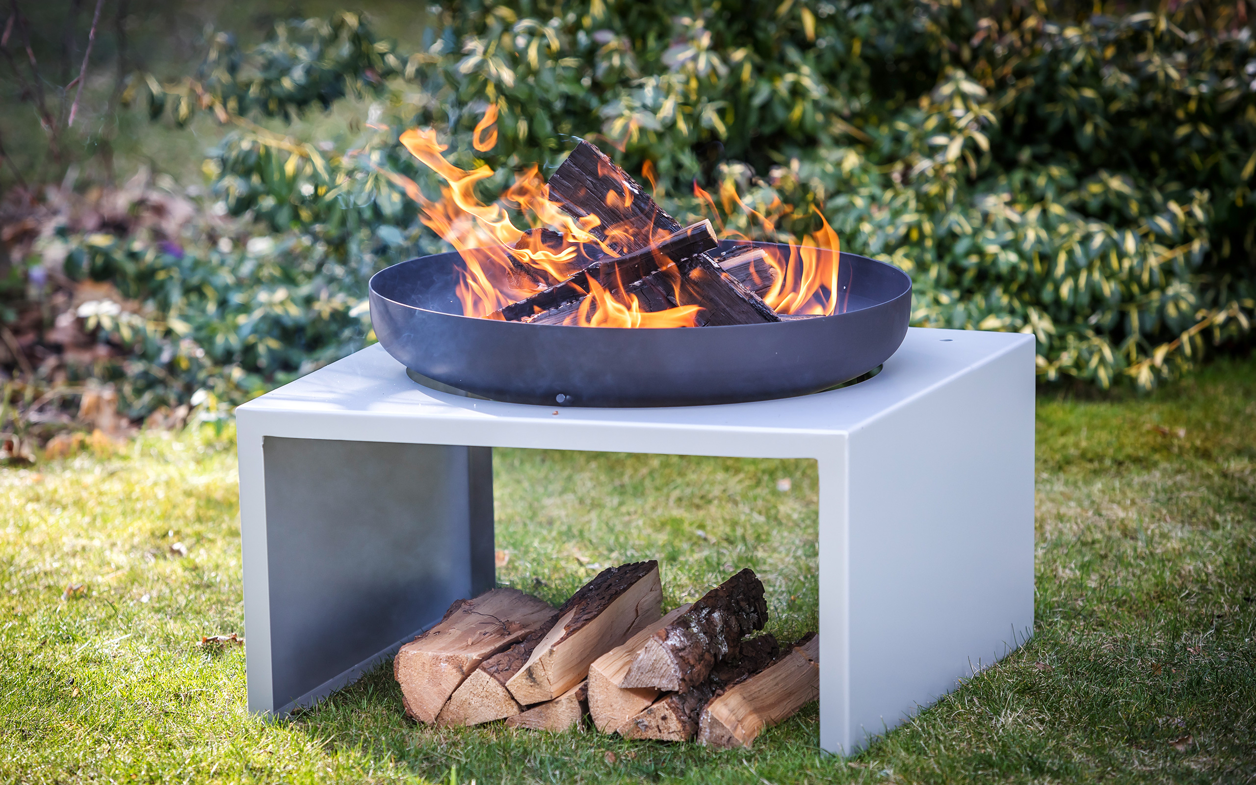 Bei kompakten Abmessungen sorgt die Feuerschale MODERNE für ein stimmungsvolles Feuer und gemütliches Grillvergnügen. Der pulverbeschichtete Korpus dient als praktisches Holzlager.